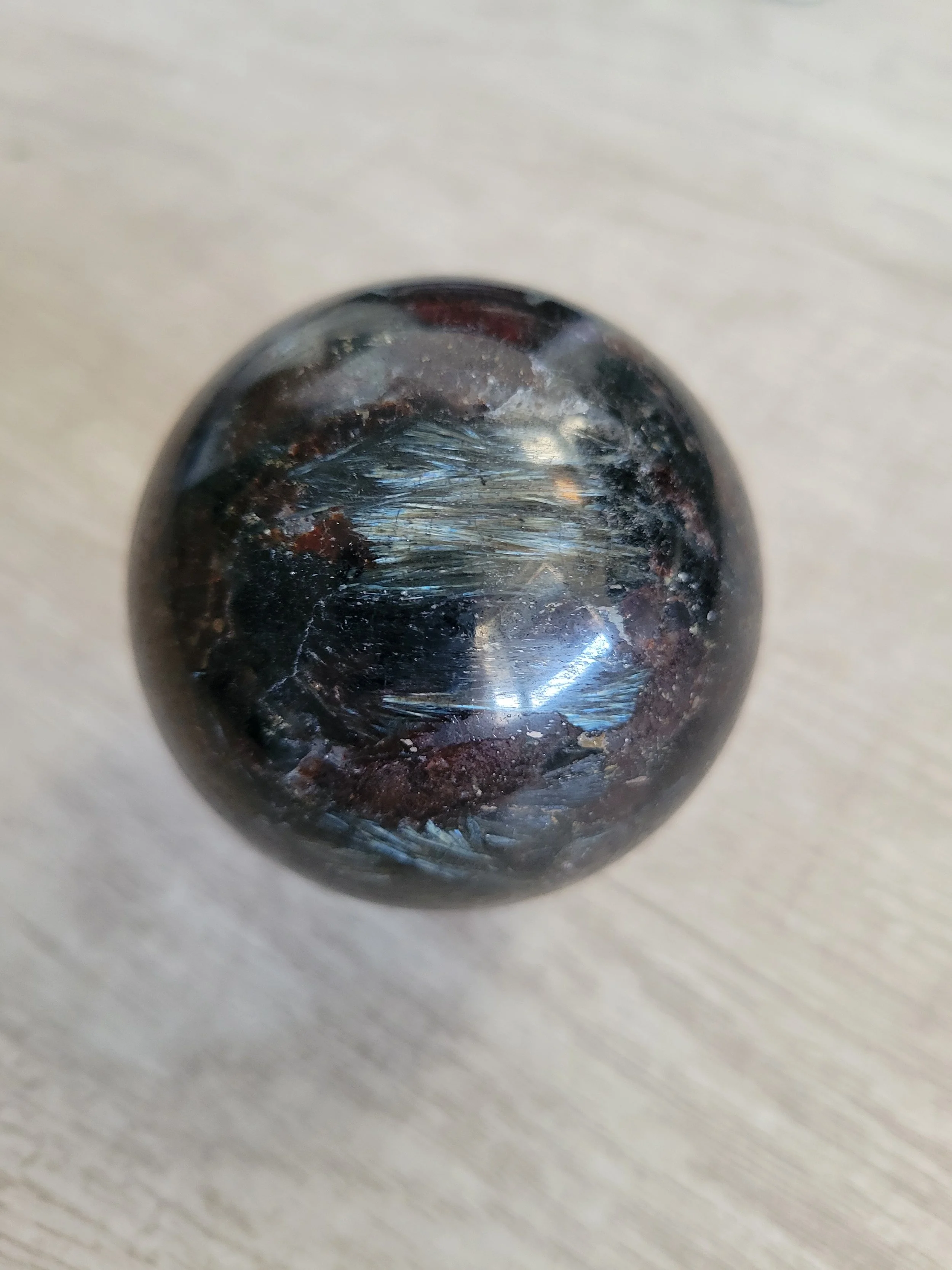 This astrophyllite sphere measures approximately 7.5 in in circumference (≈ 2.4 in diameter) and features striking blue blades of astrophyllite radiating through a dark matrix. Its metallic flashes shimmer under light, creating a starburst effect that gives this rare mineral its name.